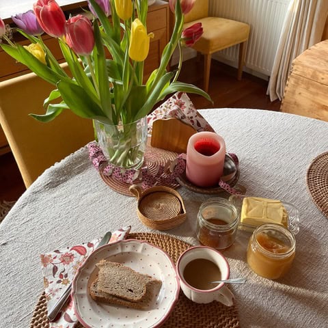 Jetzt kommt mein Frühstück. Die Tulpen haben frisches Wasser bekommen. Ich bekomme Kaffee und Brot mit selbst gemachter Pfirsichmarmelade mit Pfirsichen aus dem eignen Garten. Die Girlande auf dem Tisch stammt noch vom Geburtstagsfest mit einer Freundin vor einigen Tagen. Ich finde sie schön, daher darf sie bleiben.