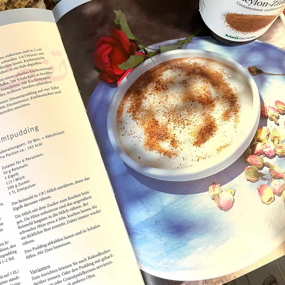 Zeit für ein Kochexperiment. Noch inspiriert von unserer Oman-Reise (zum Glück noch vor Kriegsbeginn) und von einem orientalischen Kochbuch, das ich vor 21 Jahren von meinem Bruder bekommen habe, koche ich heute einen Zimtpudding aus Reismehl. Er gelingt! Er schmeckt! Nur etwas gelber ist er geworden, als der im Buch.