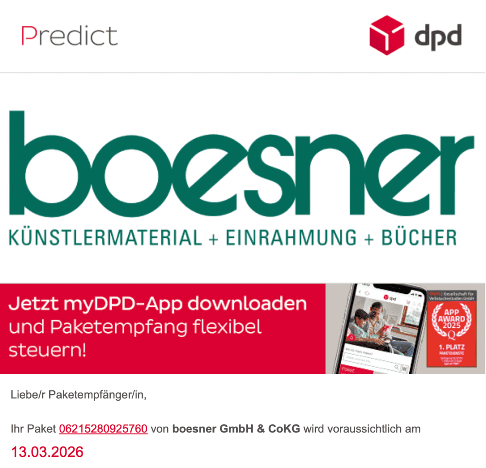 Oh, ich bekomme gerade eine E-Mail. Der Paketzusteller informiert mich über die Zustellung meiner Leinwände. Morgen sind sie hier, das heißt, ich kann starten und in Serie gehen.