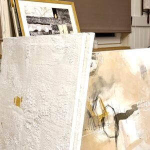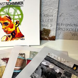 Ich hatte einen beträchtlichen Teil meiner großen Bilder ins Atelier transportiert und auf Staffeleien präsentiert. Dazu natürlich kleine Formate und die traditionelle Schnäppchen-Box. Diesmal legte ich auch Kataloge von Messen, an denen ich teilgenommen hatte, auf und meine Broschüren über Collagen, Marmor & Asche und Mixed Media Papierarbeiten.