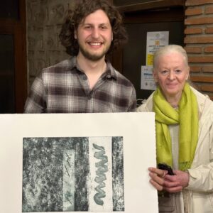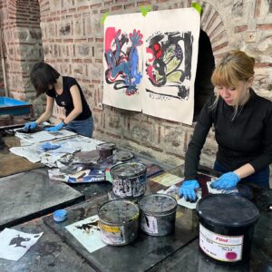 Bei unserem ersten Spaziergang durch die Innenstadt von Skopje entdeckte ich einen Eingang in einen Innenhof, der mich anzog und den ich sofort erforschen wollte. Bingo! Ich hatte den Nagel auf den Kopf getroffen. Es war, ich glaubte es kaum, die Fakultät für Kunst. Im Hof angekommen erblickte ich sofort die riesigen Glasfenster, die den Blick in Räume mit großen Tischen und Druckmaschinen freigaben. Zwei Studentinnen werkten gerade eifrig. Ein junger Student, Mihail, wie sich kurz später herausstellte, war gerade nicht am Tun. Den peilte ich an, stellte mich vor und fragte, ob ich mich in den Werkstätten ein bisschen umsehen dürfe. Ich durfte. Es stellte sich heraus, dass er sein Studium bereits abgeschlossen hatte und eine Art Instruktor für die anderen Studenten war.